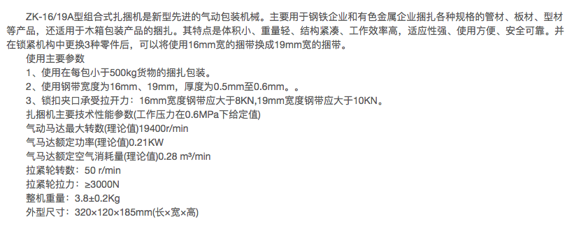 ZK-16/19A型组合式气动钢带主要用于捆扎包装彩色卷板和外包装使用木箱的产品,也适用于木制品业、造纸业、玻璃制造业的产品捆扎包装。其特点是以操作者的双手为动力,操作灵活方便、快捷。适应任何场地作业。本机不使用锁扣、降低了包装成本。