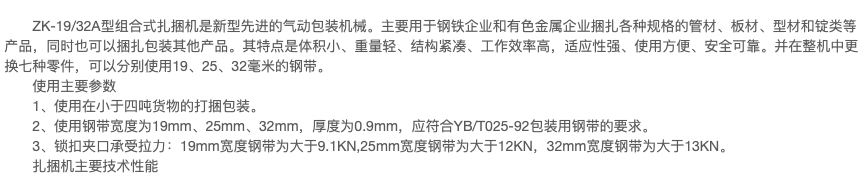 ZK-19/32A型组合式气动钢带主要用于捆扎包装彩色卷板和外包装使用木箱的产品,也适用于木制品业、造纸业、玻璃制造业的产品捆扎包装。其特点是以操作者的双手为动力,操作灵活方便、快捷。适应任何场地作业。本机不使用锁扣、降低了包装成本。