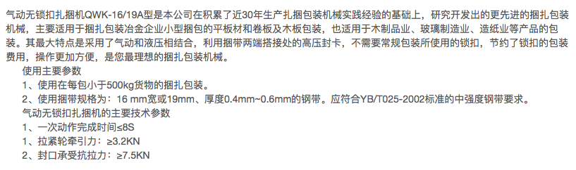 QWK-16/19A型手动无锁扣扎捆机主要用于捆扎包装彩色卷板和外包装使用木箱的产品,也适用于木制品业、造纸业、玻璃制造业的产品捆扎包装。其特点是以操作者的双手为动力,操作灵活方便、快捷。适应任何场地作业。本机不使用锁扣、降低了包装成本。