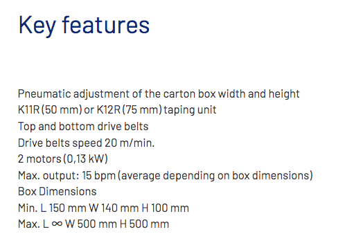 SK20是SIAT专门为中型固定尺寸盒子设计和制造的半自动封箱机。SK20是食品饮料、化工、服装、纺织、电子、家具和金属容器等行业的理想封箱机。